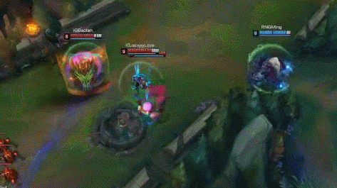 • 由于Q技能是有读条时间的,所以牛头可以Q闪,然后把人顶回来。经典场景:牛头,滑板鞋,二塔.gif。
