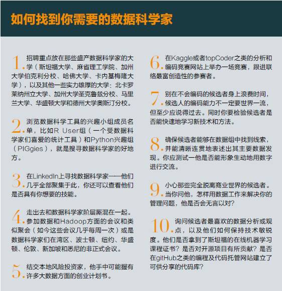 如果说,对大数据的利用很大程度上依赖于聘用稀缺的数据科学家,那么管理者面临的挑战就是学习如何发现和招聘这些人才并为公司所用。这些任务一旦与管理者的其他组织角色结合,便不再像看上去那么简单明了。