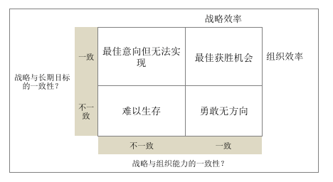 (4)难以生存:在两个“一致性”方面都得分低的企业将处于危机中,即使现在表现不明显。他们的战略不会且不能实现更大的目标,因为他们不能有效地解决顾客喜好、市场状况和竞争对手等方面的问题。同样重要的是,他们的组织也无法执行战略重点。